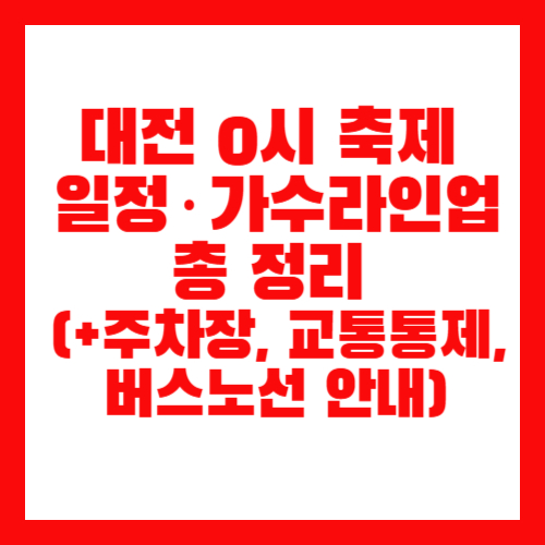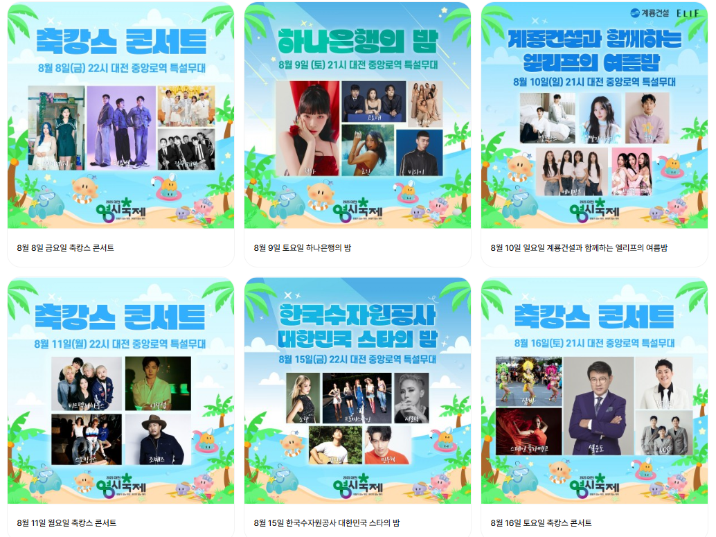 중앙로, 대전역, 프린지 무대 등 총 3개 무대에서 펼쳐지는 이번 축제는 매일 밤 0시까지 콘서트와 퍼레이드가 이어지고,아이브, 세븐틴, 청하, 싸이, 김연자 등 대한민국 대표 가수들이 총출동합니다.