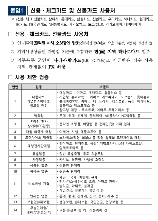 - 제한 업종: 백화점, 대형마트, 유흥업소, 온라인 쇼핑몰 등 **사용불가**