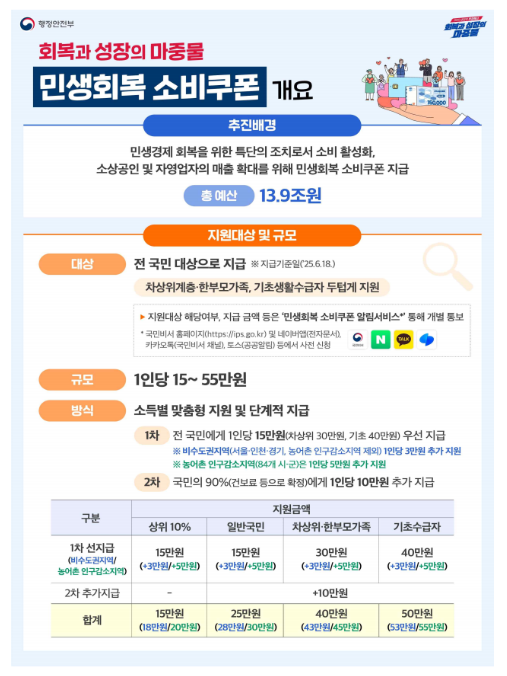 민생회복 소비쿠폰은 모든 국민에게 제공되는 실질적 복지혜택입니다. 특히 비수도권·인구감소지역 거주자라면 지역 중첩 혜택으로 **최대 55만 원**까지 받을 수 있습니다.