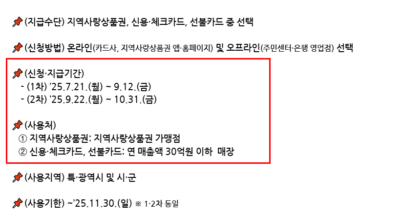 - 신청방법: 온라인(카드사/상품권 앱) 또는 오프라인(주민센터/은행 영업점)