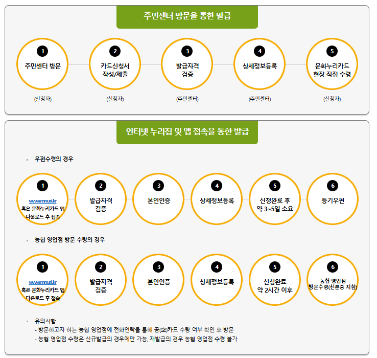 - 앱: 문화누리 앱 설치 → 인증 → 신청