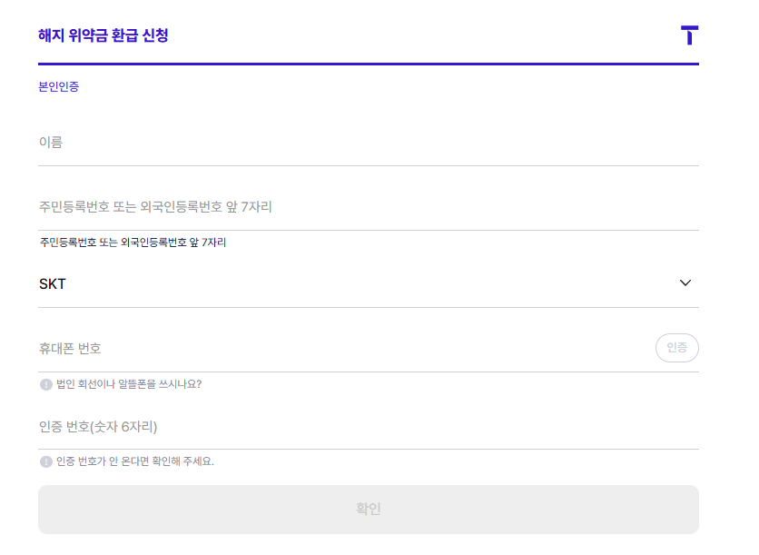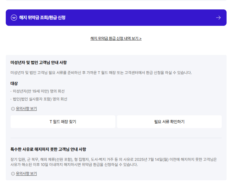 - T월드 앱: ‘위약금 환급 조회’ 클릭 → 본인 인증