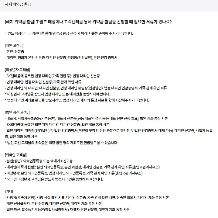 T월드 매장 또는 고객센터를 통해 환급을 신청할 경우, 아래에 해당하는 유형별로 서류를 준비하셔야 합니다.